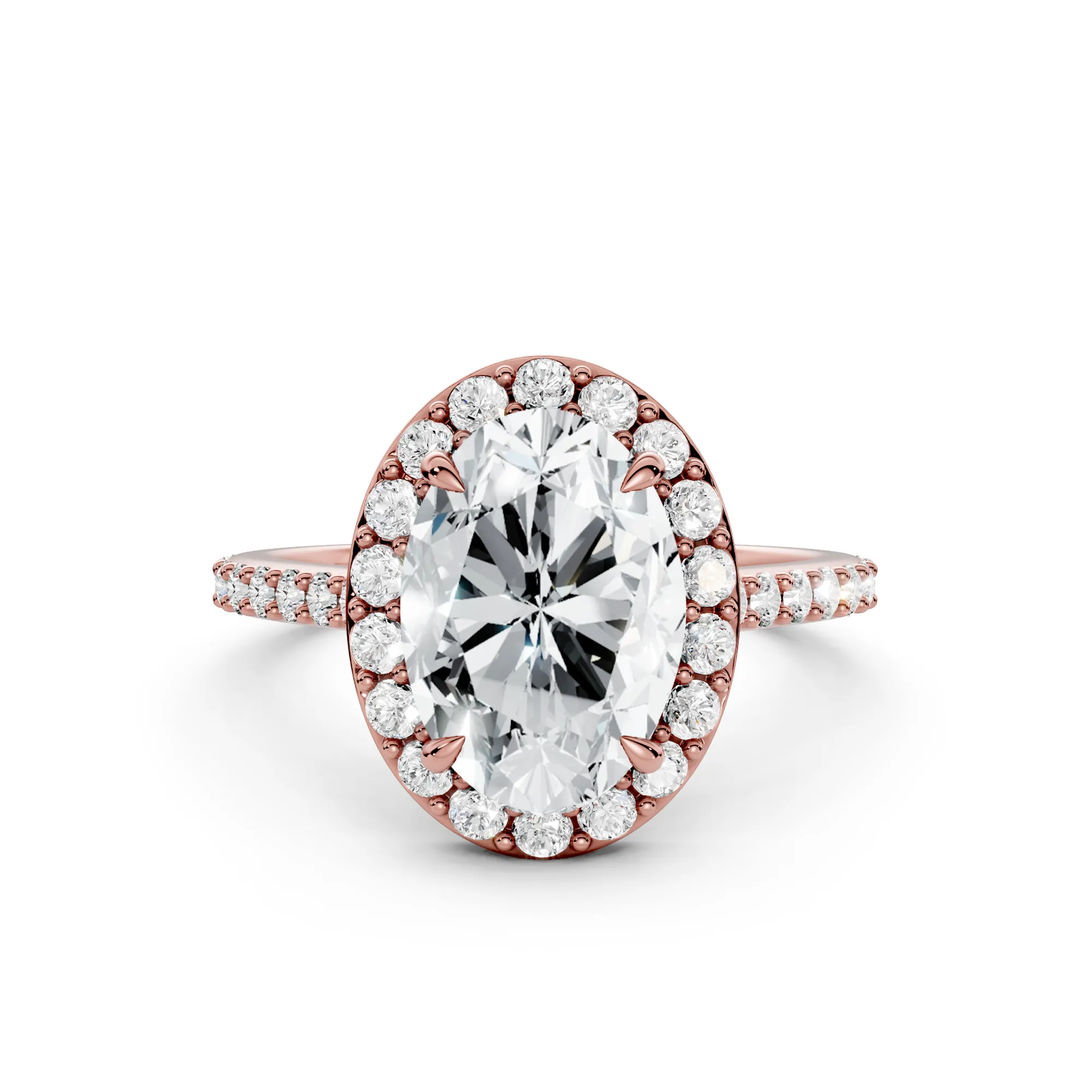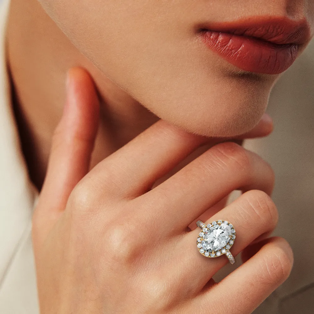 This classic oval engagement ring features an oval-cut center diamond in a seamless Halo setting, paired with a sleek gold band, plus side accent diamonds for all-angle sparkle. Its precisely cut center stone refracts soft, moon-like light, blending celestial charm with wearability—ideal for marking your proposal with a love symbol as vast as the heavens.