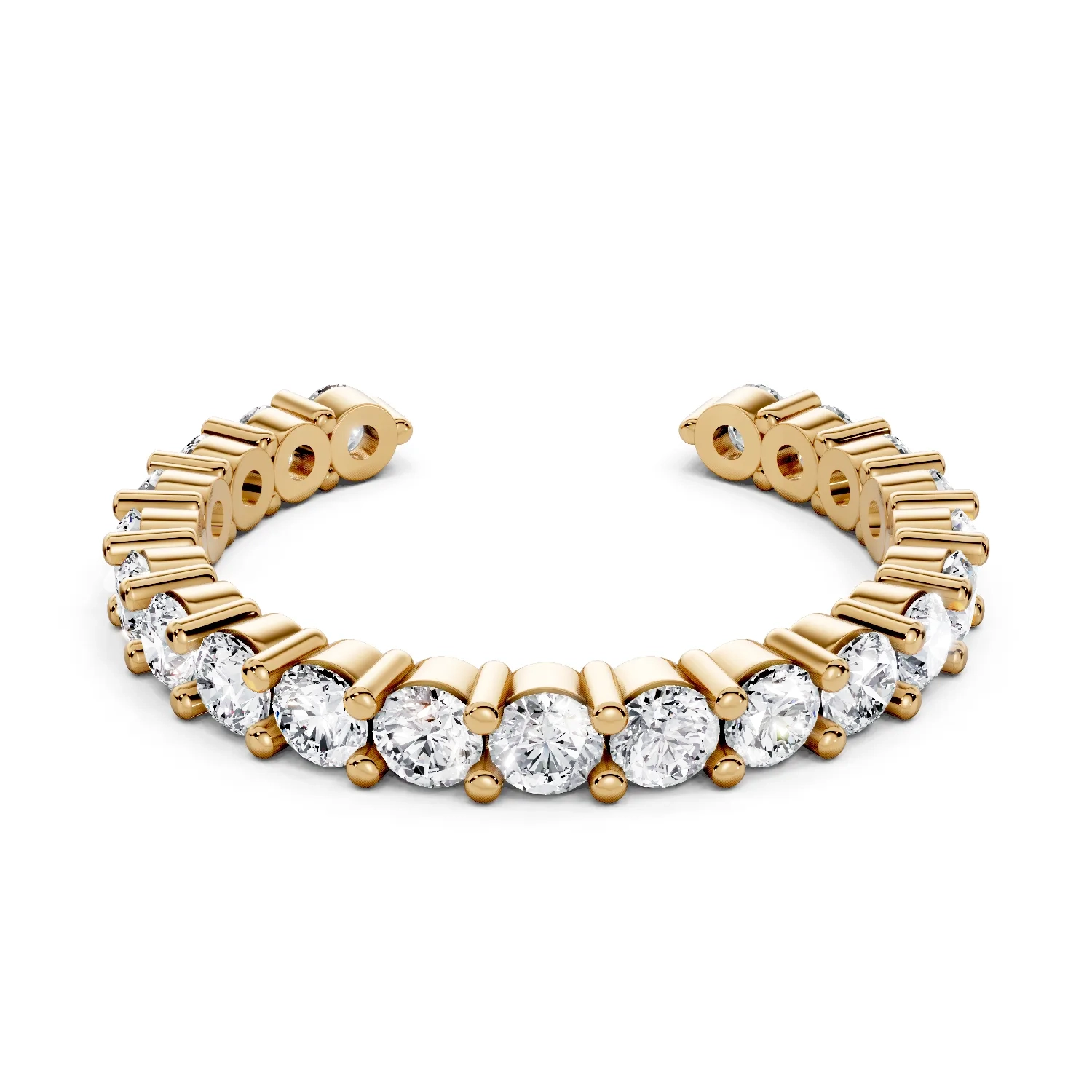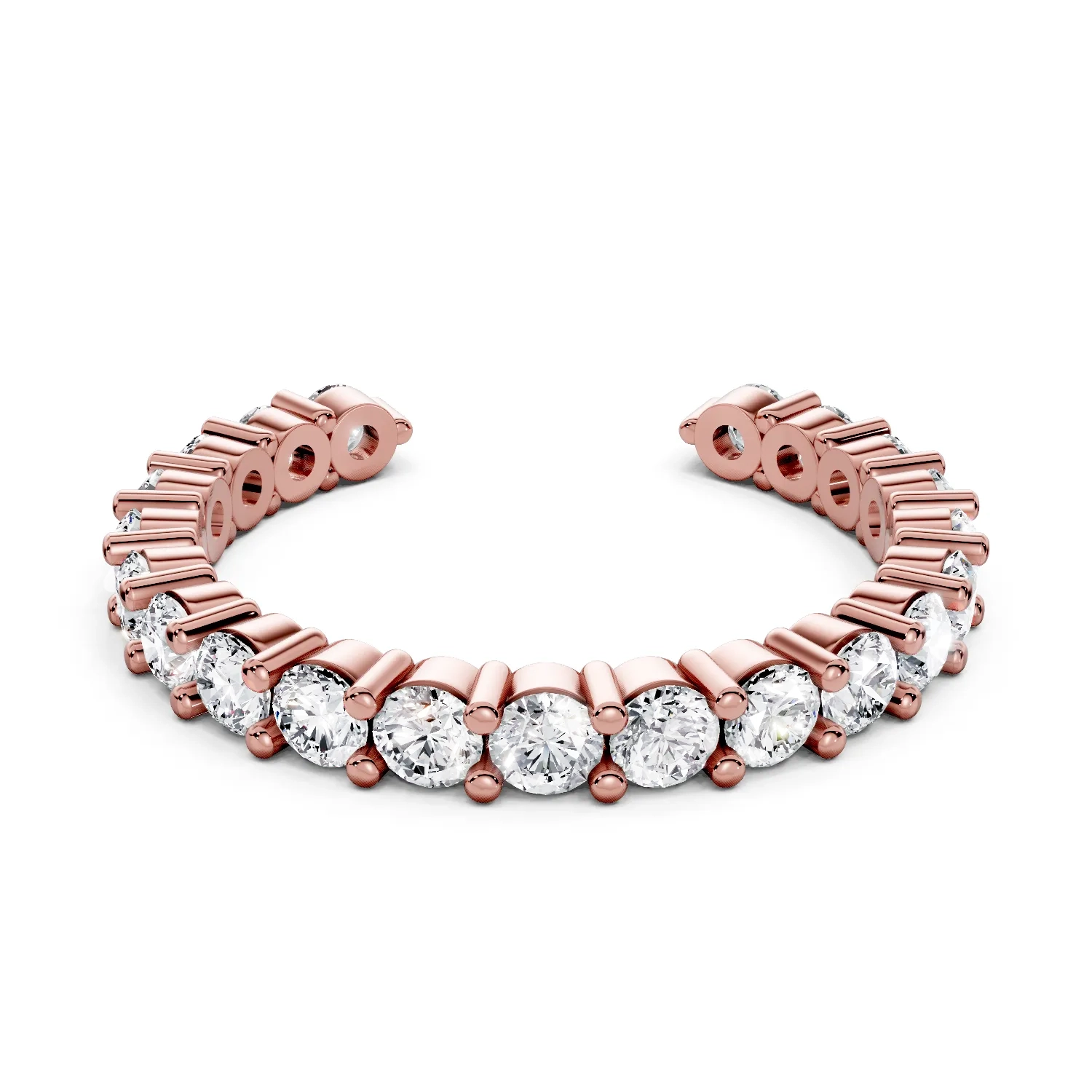This open diamond wedding band features a 3/4 coverage of round diamonds in a shared prong setting with light pass openings for maximum brilliance.
