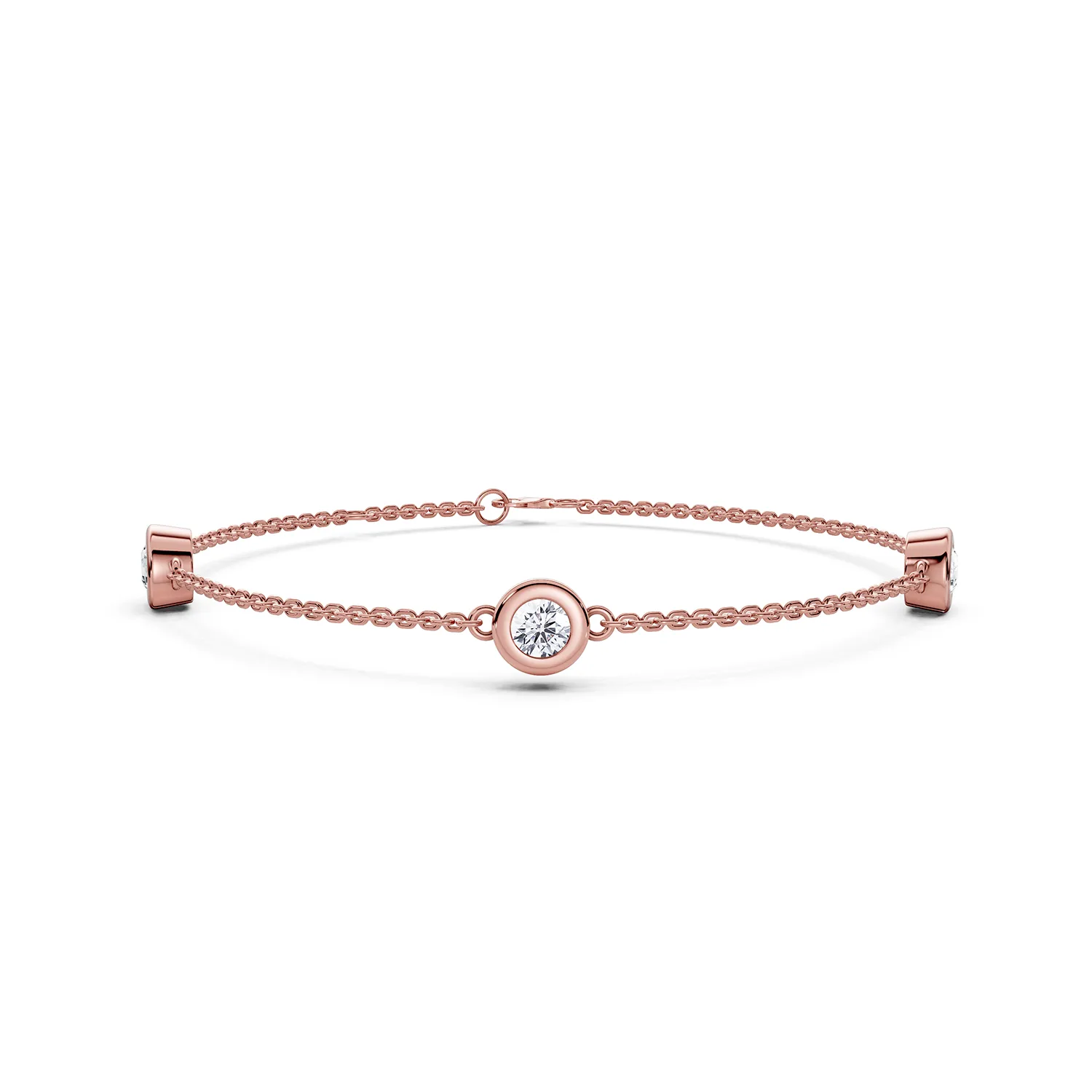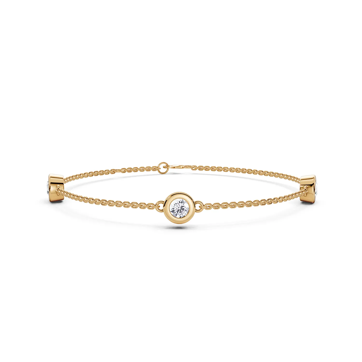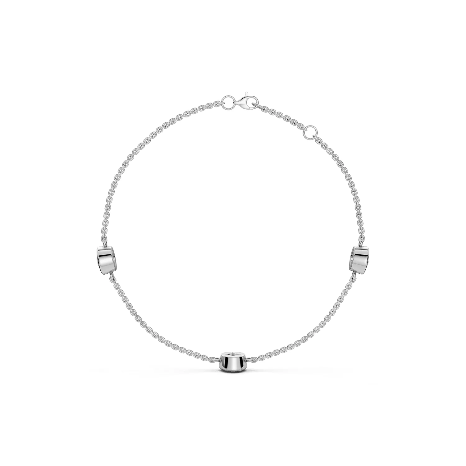 This minimalist bracelet features three bezel-set round diamonds spaced evenly along a delicate chain. Each diamond is framed in a polished bezel setting for a modern, elegant look. Perfect for layering or wearing alone, this bracelet adds a touch of refined sparkle to any outfit—ideal for everyday wear or as a meaningful gift.
