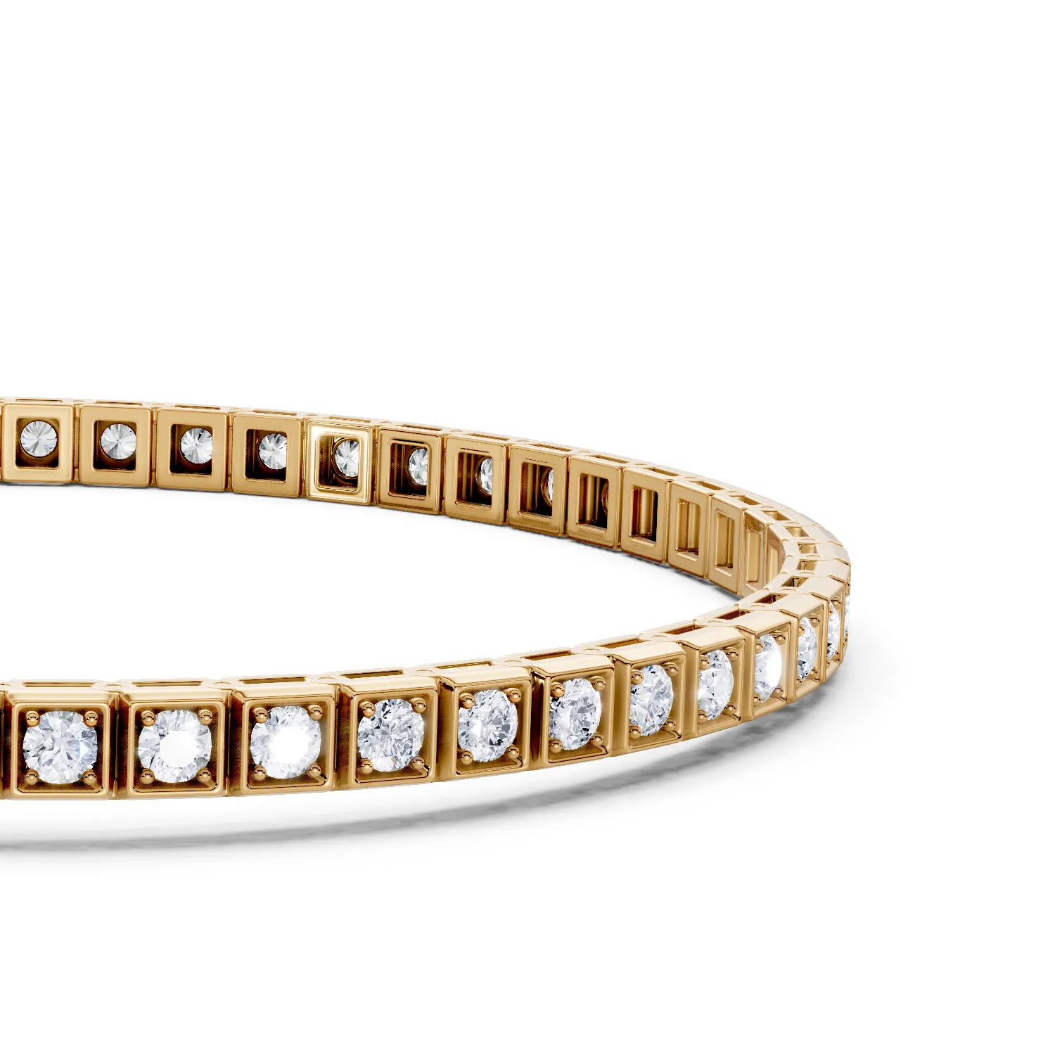 This elegant tennis bracelet features round diamonds set in a timeless bead and bright setting, each nestled in a refined square basket base. Designed for brilliance and security, the structure allows light to pass through, enhancing every stone’s sparkle. A classic tennis design with modern craftsmanship, perfect for stacking or standalone elegance. Ideal for everyday wear or special occasions. A must-have diamond bracelet for lovers of timeless, radiant style.