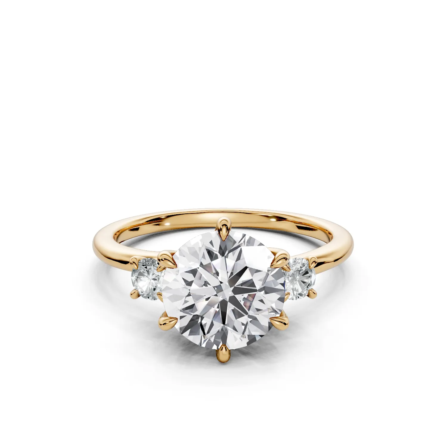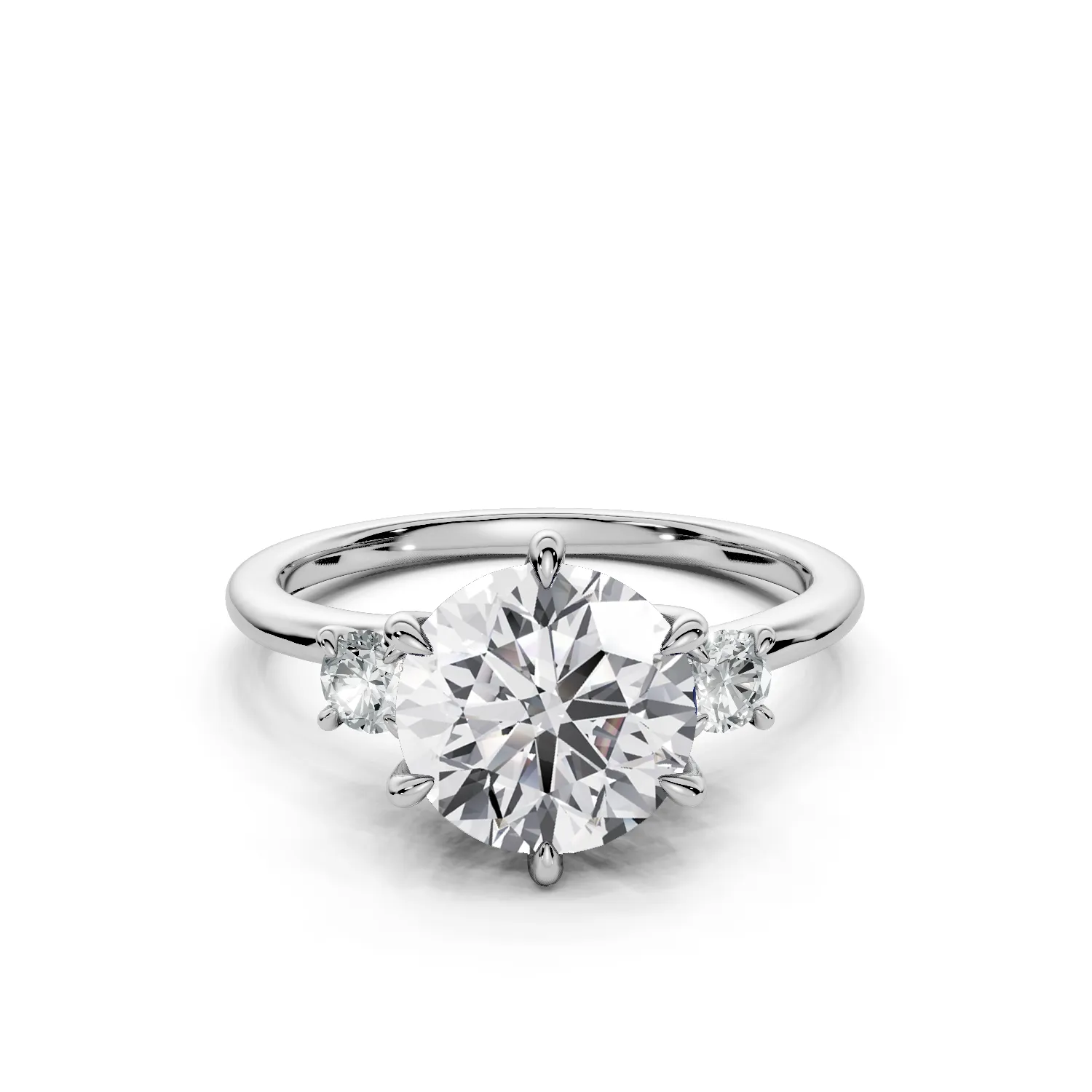 This stylish three-stone ring features an round/oval center diamond in a secure six-prong setting, accented by two round side stones.