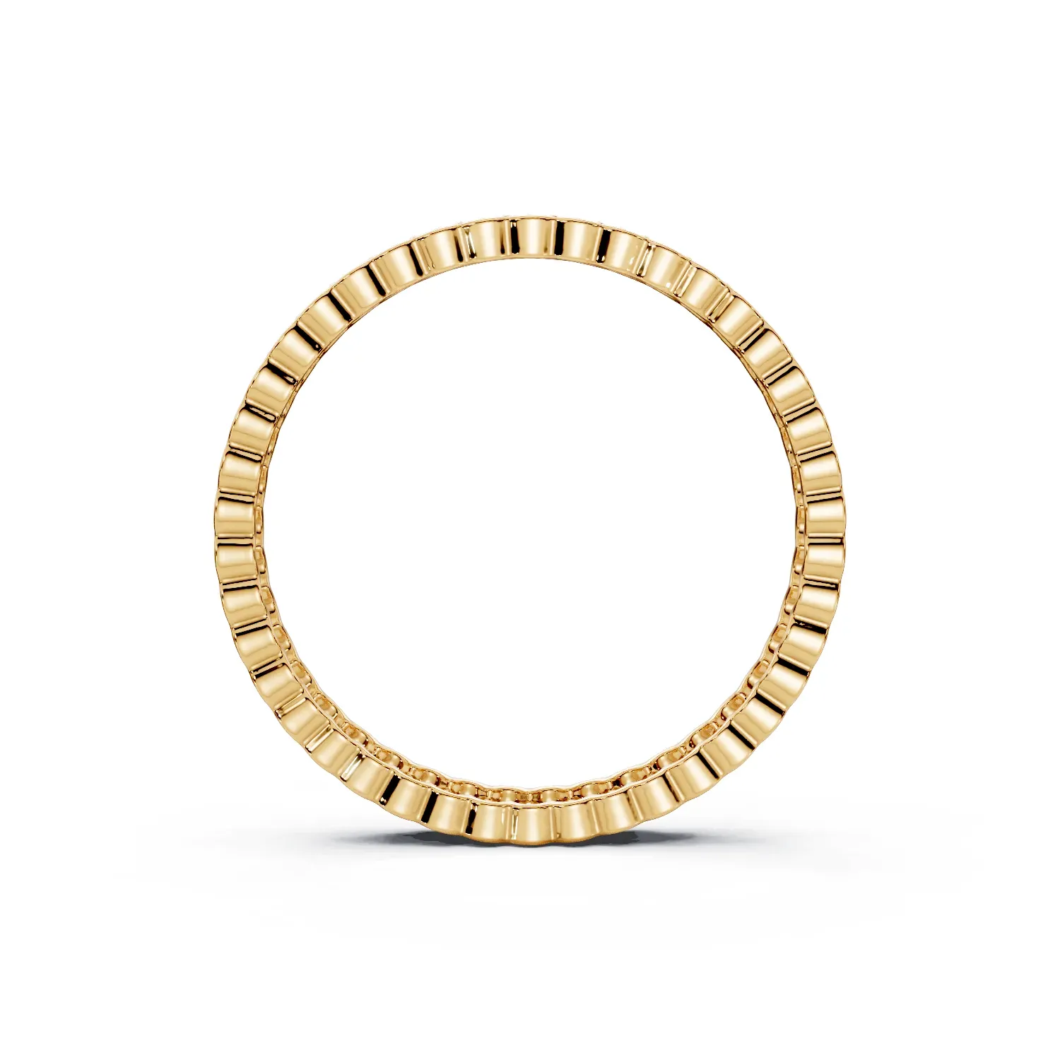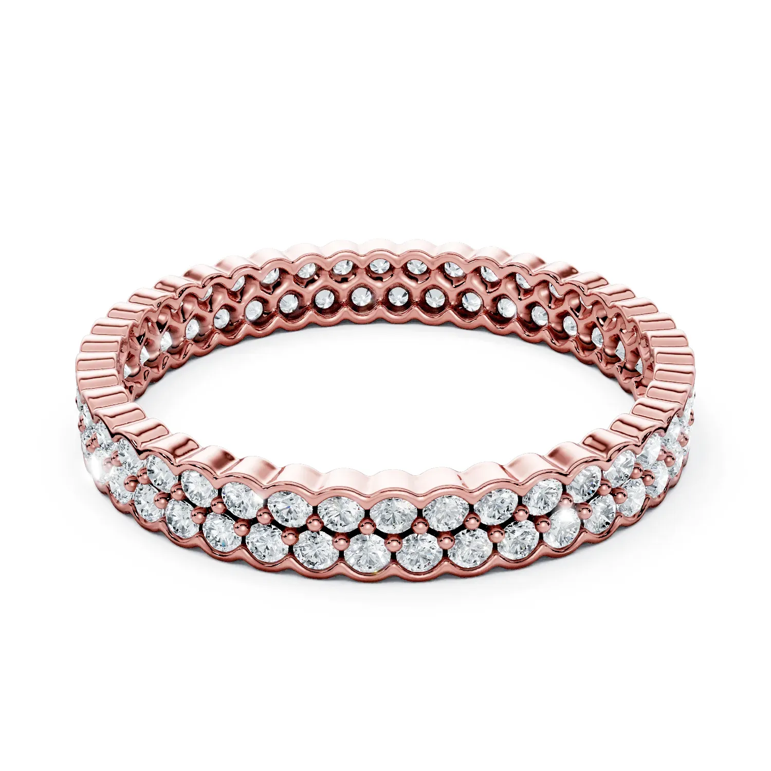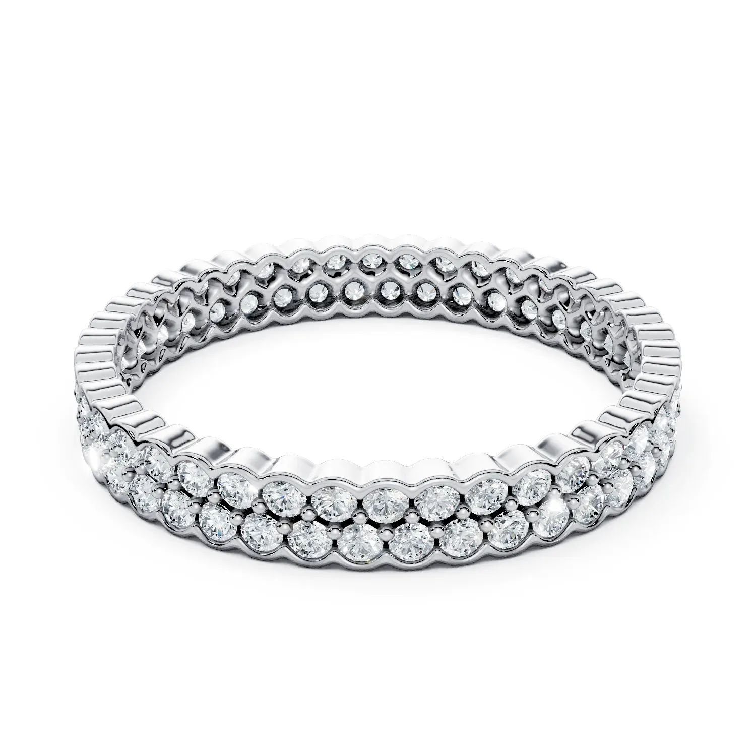 This modern eternity band features two rows of round brilliant diamonds in a misaligned, offset pattern. Each diamond is delicately set with internal prongs and framed by a sleek half bezel on the outer edge. The light pass design maximizes brilliance, while the double row style adds bold sparkle. A perfect full-coverage diamond ring for stacking or standalone elegance. Ideal for bridal, anniversary, or everyday luxury.