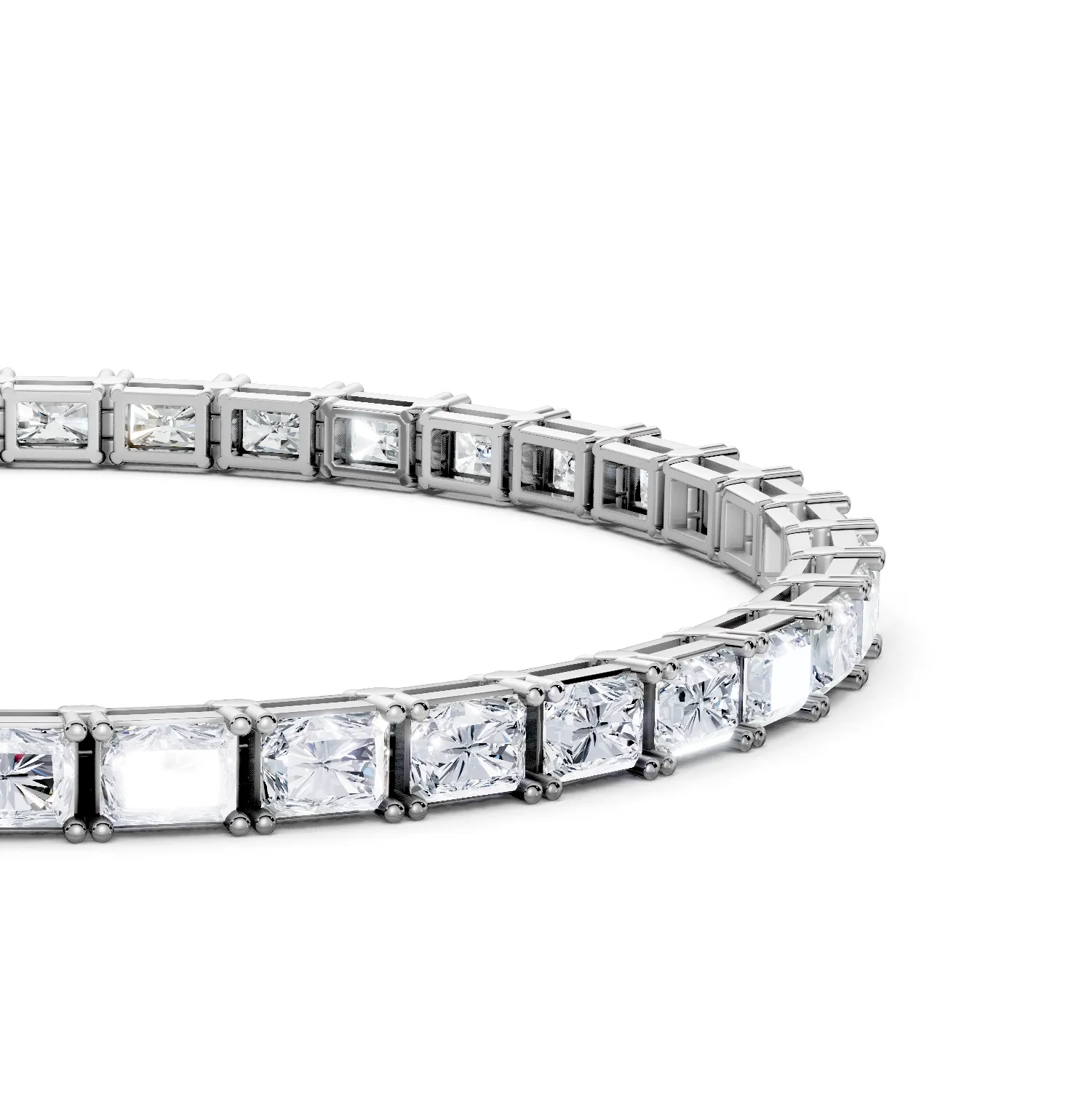 This elegant tennis bracelet features radiant-cut diamonds set in a sleek east-west orientation, secured by classic four-prong square baskets. The unique horizontal layout adds a contemporary twist to a timeless design, maximizing sparkle and visual length. Perfect for modern, everyday luxury.