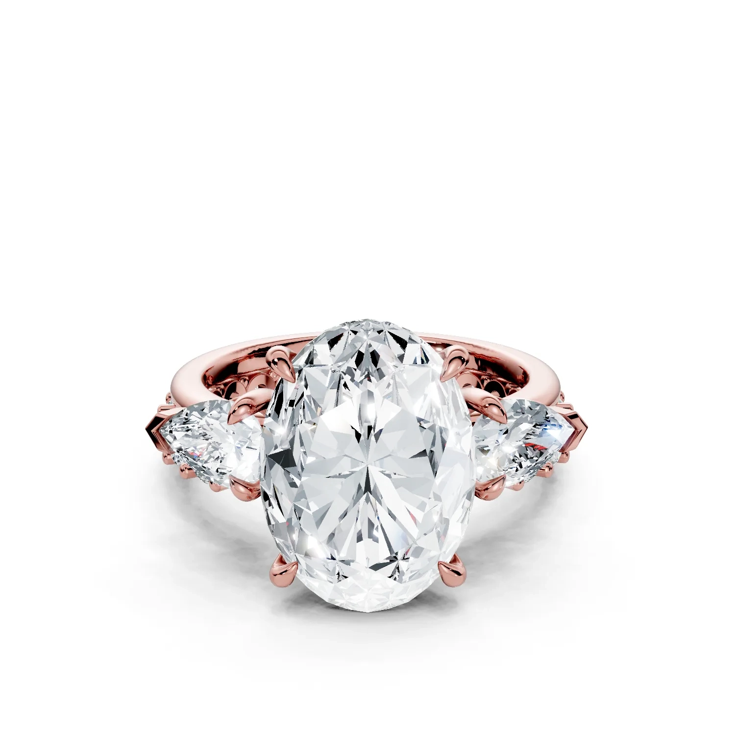 The Forever Oval Side Stone Set features a 4.00 carat oval lab grown diamond set in a classic four-prong gold band. Paired with an open wedding band adorned with petite round diamonds and two pear-shaped side stones, this bridal set creates a refined three-stone look. Timeless, symbolic, and luminous — it’s a design meant to celebrate love that lasts forever.