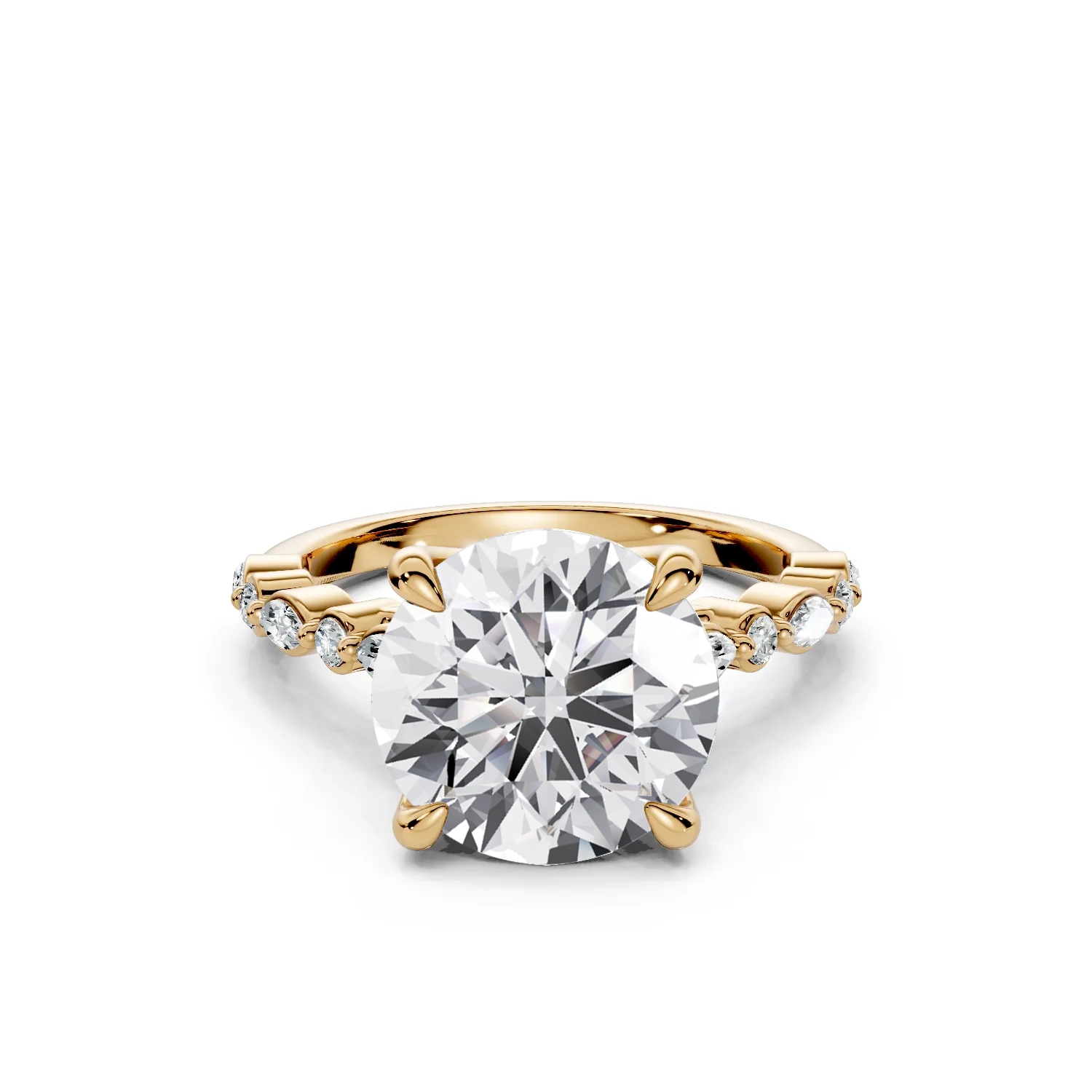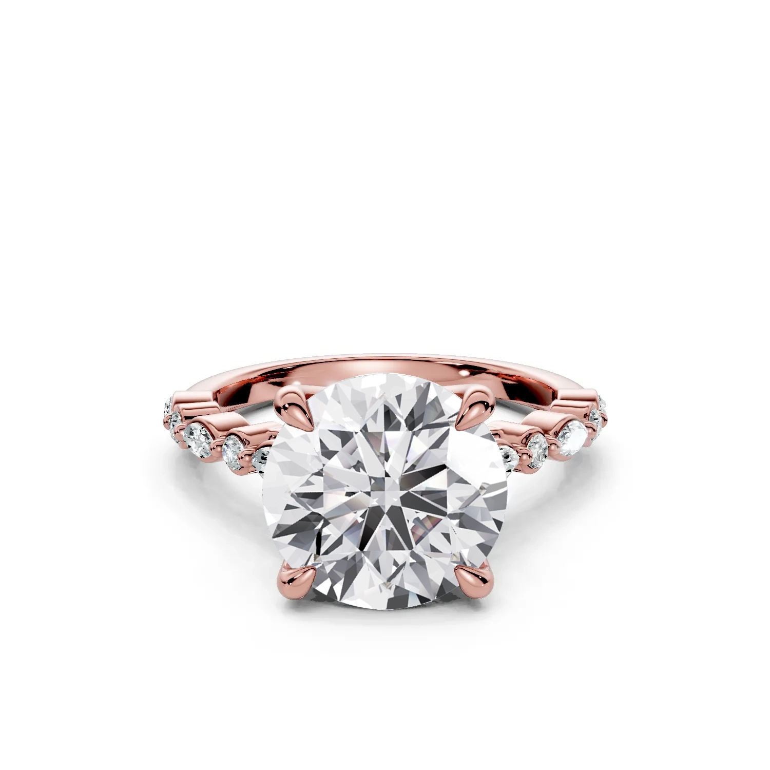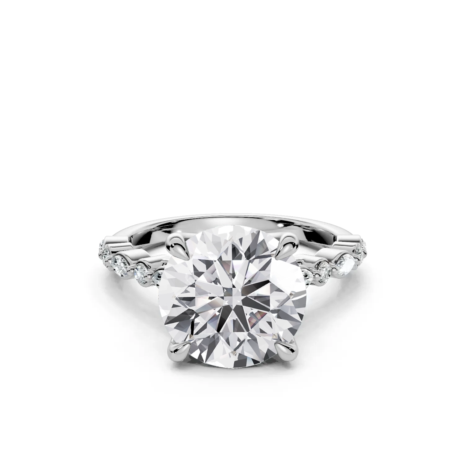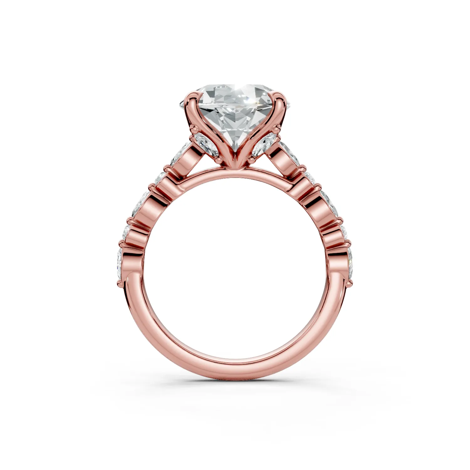 This unique solitaire ring features 9-cut-option center diamond set in a floral four-prong design, with marquise diamonds delicately inset between each petal.