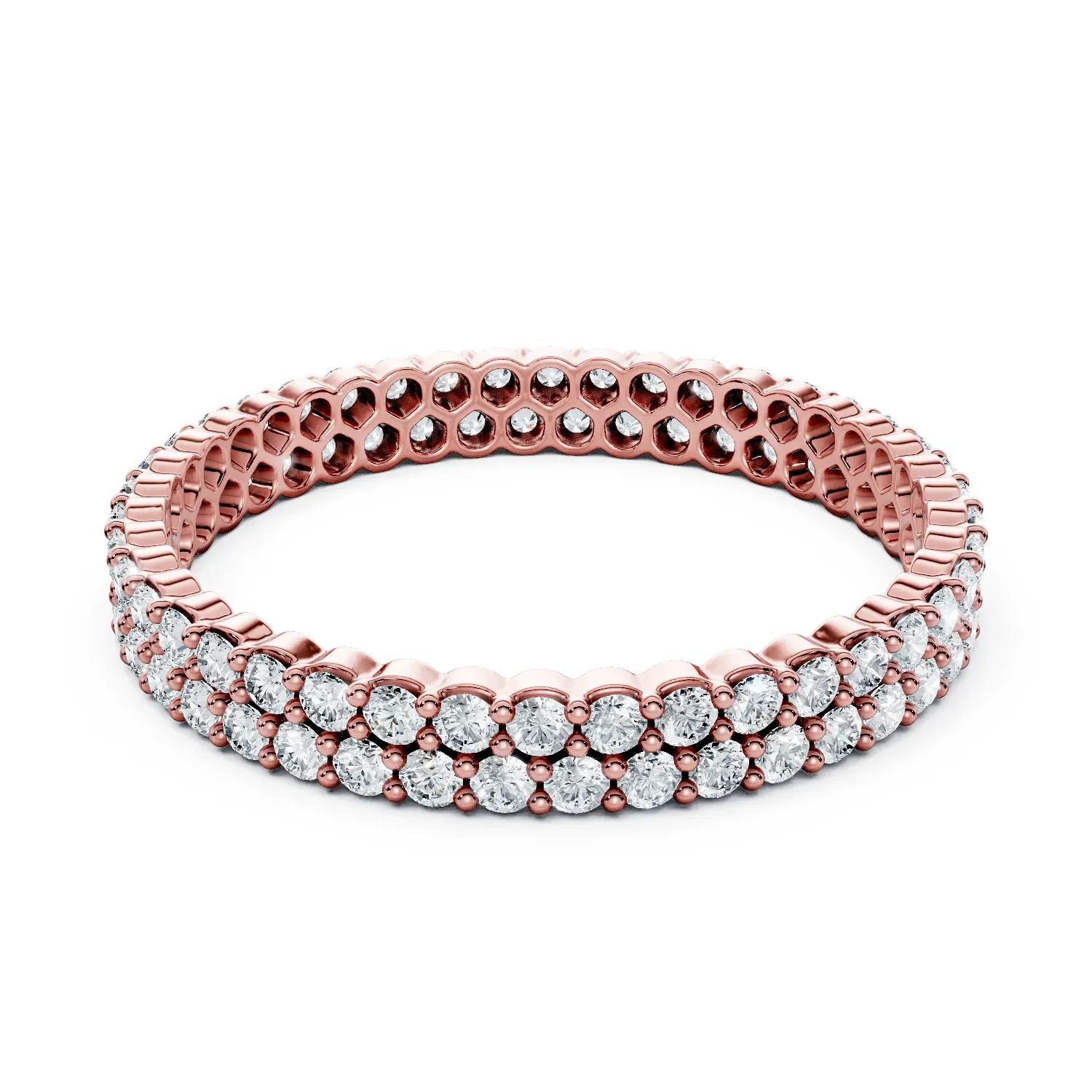 This elegant eternity ring features two misaligned rows of round diamonds in a prong and pavé setting, inspired by the natural rhythm of Prunus mume blossoms. The light pass design enhances brilliance, while the staggered alignment adds texture and modern flair. The width is 2.8mm. Perfect for stacking or wearing solo, this diamond band blends classic sparkle with unique style—ideal for wedding, anniversary, or fashion wear. A timeless choice with a designer edge.