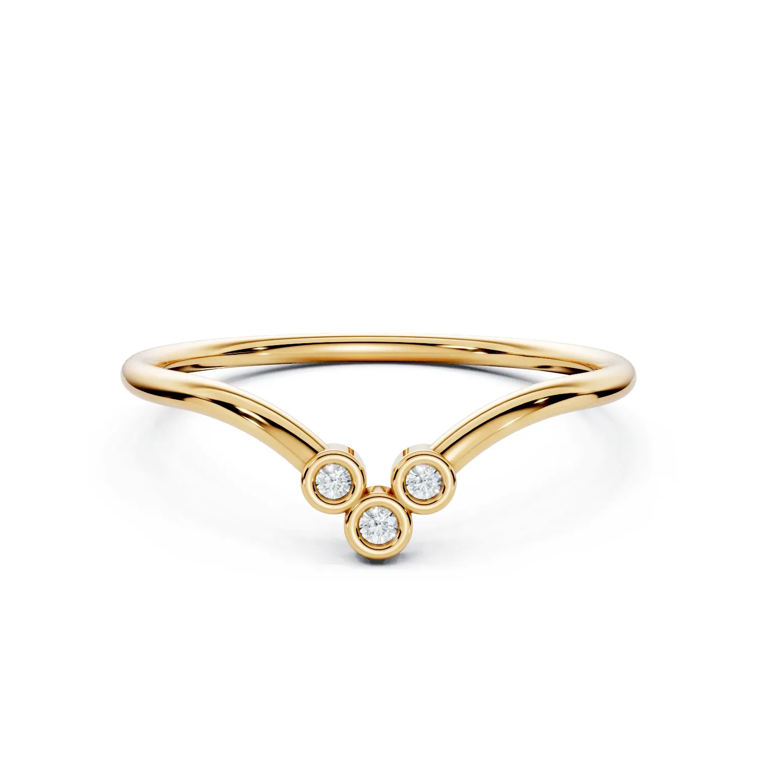 A sculptural curved diamond band defined by a bold V-like angle and luminous simplicity. Three bezel-set round lab diamonds highlight the curve’s sharpest point, creating a radiant focal accent. With 1/4 coverage and a light-pass structure, this design balances strength and openness — a refined, modern silhouette that layers beautifully or shines on its own with quiet confidence.
