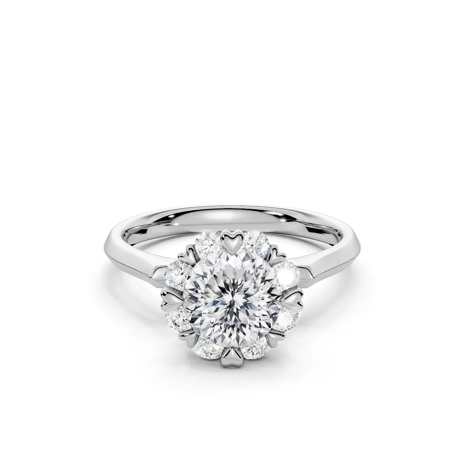 A bold take on elegance, the Vivre ring pairs eight diamonds in heart-shaped prongs with a center double brilliance stone secured by four elongated claws.A hidden halo and outstanding profile enhance brilliance from every angle. The knife-edge band and sculpted shoulders evoke the elegance of opera-inspired silhouettes. Crafted with Vivre’s signature craftsmanship, this engagement ring blends intricate detail with refined, flowing lines—perfect for a modern romantic with a love for design.